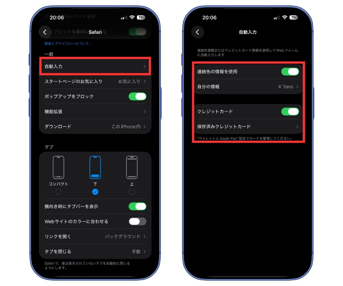 2.設定 → Safari → 自動入力 → 「連絡先」「クレジットカード情報」など